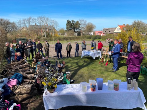 River, vandkander og frøposer var klar den 20. april 2022. Ligesom der var saftevand og et stykke dejlig kage til de små travle gartnere.